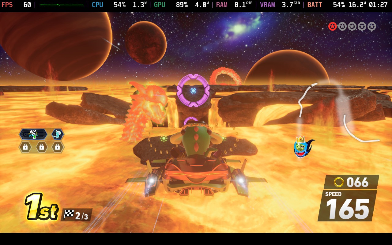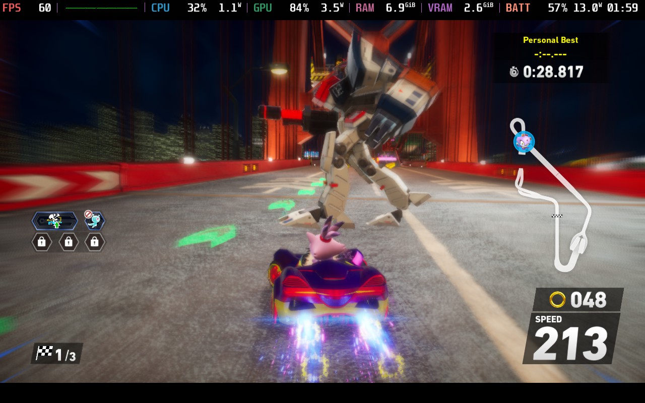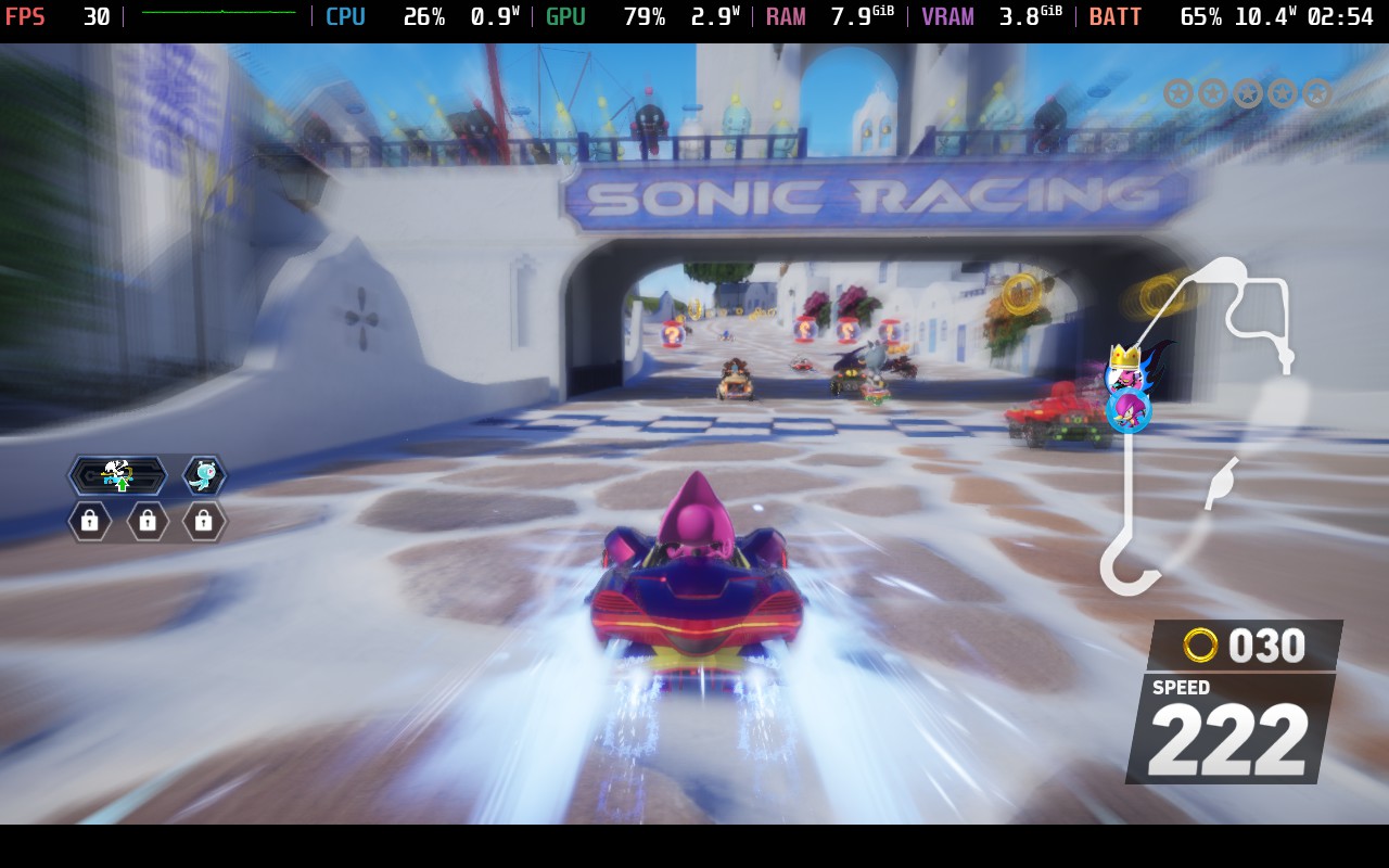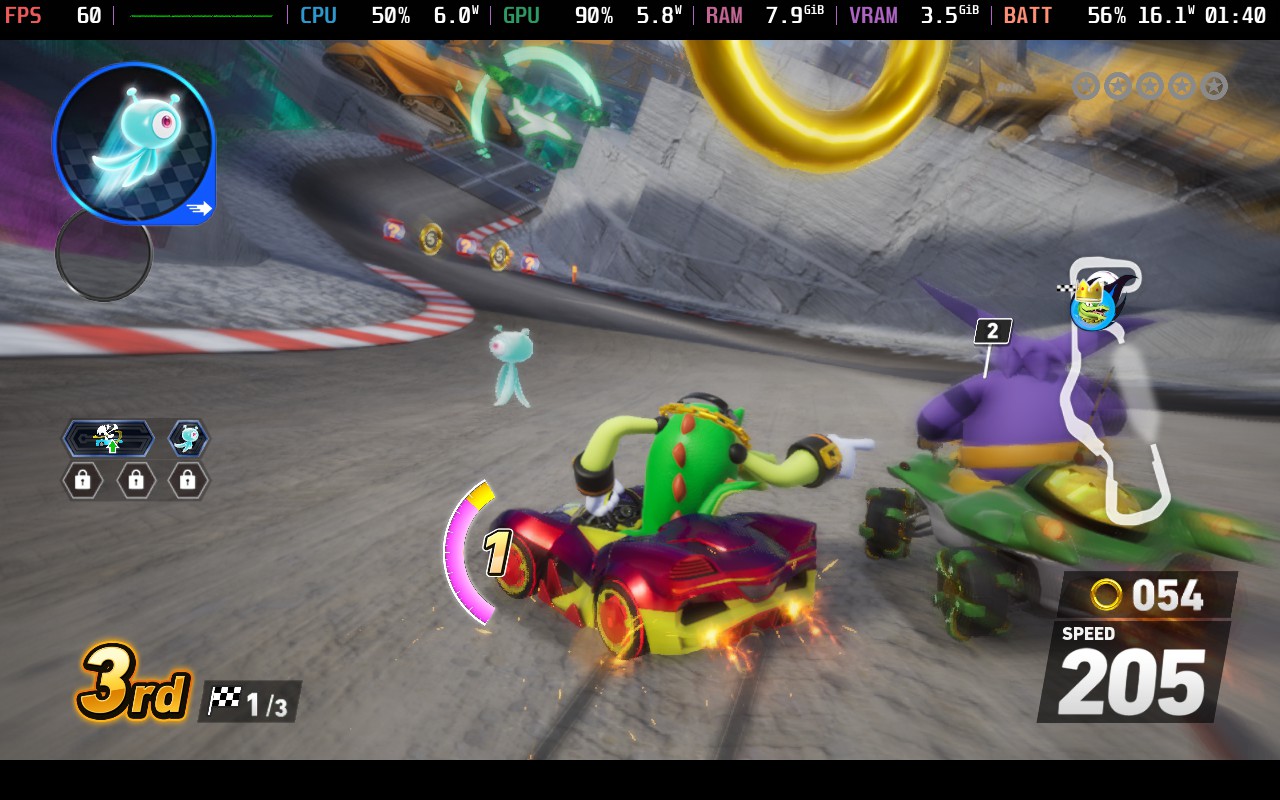 Choosing recommended settings for Sonic Racing was a tough one, but ultimately, I went with the most enjoyable for me personally. Despite the default settings being on the lowest with a 30 FPS limit, it can handle higher. So, after some testing, I discovered that it can run on the highest possible settings and hit 60 FPS if the render resolution is set to 75%. Overall, the game still looks really gorgeous, and I couldn't tell the difference, but with the render resolution lowered, it can hit 60 FPS with ease and stick to an average 15W - 17W battery drain.