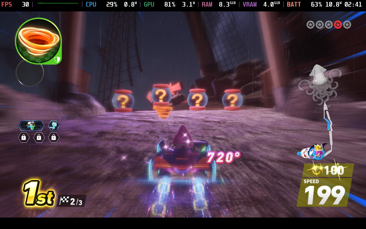 This is exactly the experience I was hoping to have in a kart racer on the Steam Deck, and even with some higher battery drain, it's just fantastic. The model looks sharp, the framerate feels smooth, and it was just a blast to play like this. If you want 100% render resolution, you could set the framerate to 40 FPS, and it should be playable, but it's not nearly as enjoyable as 60.